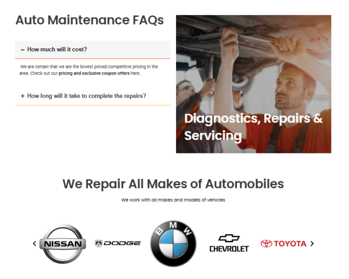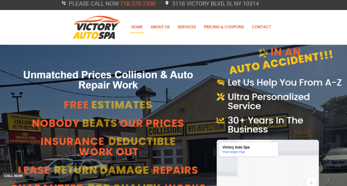 The industry/market is the Automotive Service, Repair, and Collision Market, encompassing auto collision repair, mechanical repair, maintenance (diagnostics, oil changes, tires), and auto detailing services in a local geographical area (Staten Island, NY).